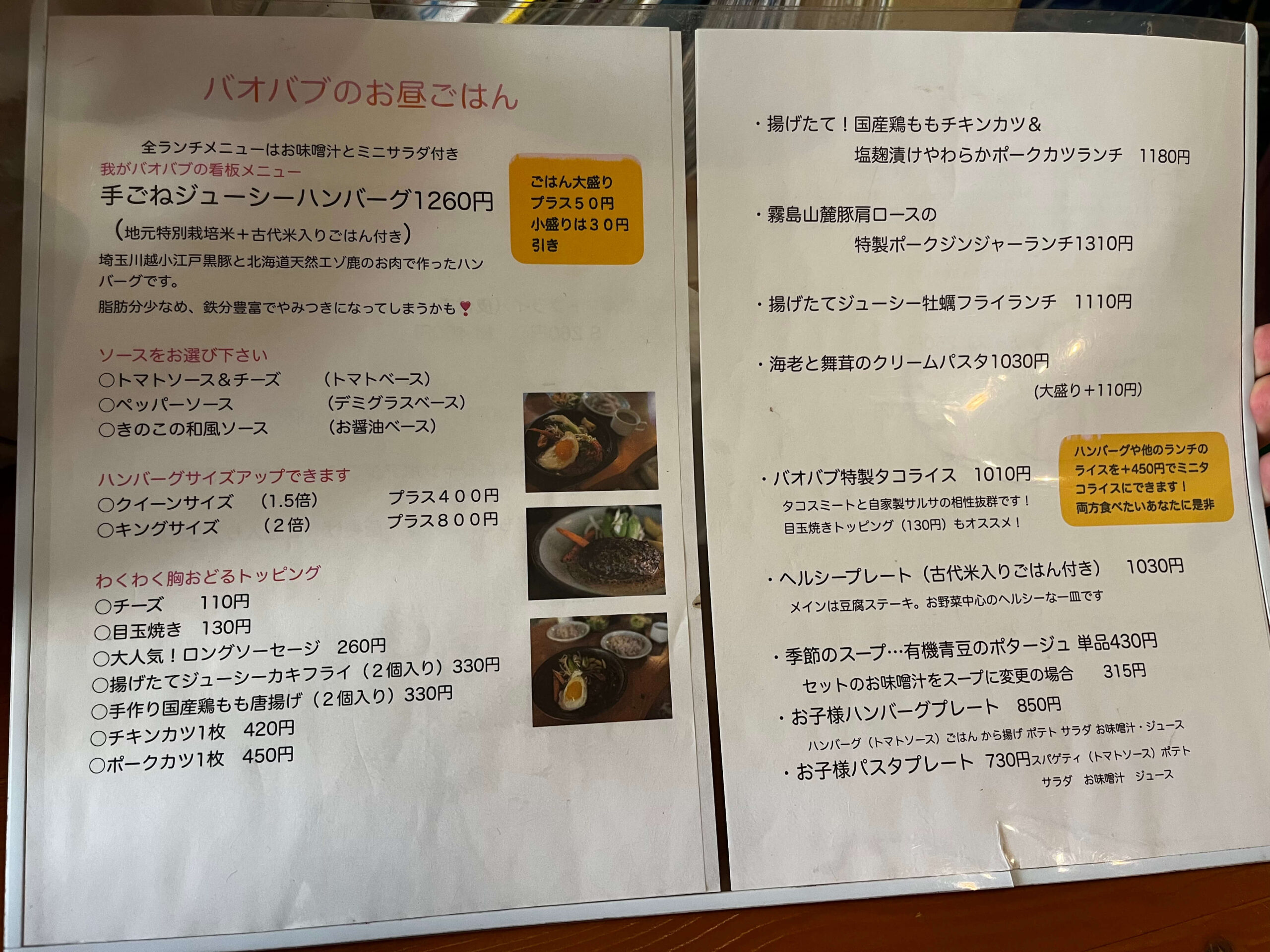 BAOBAB(バオバブ)おすすめの小江戸黒豚と北海道エゾ鹿肉を利用した『手ごねジューシーハンバーグ 1230円』を注文!